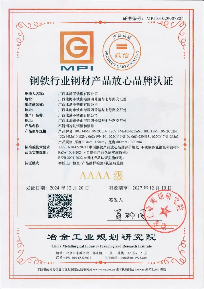 近日,北港新材料公司熱軋、冷軋鋼板和鋼帶榮獲冶金工業(yè)規(guī)劃院“AAAA”級放心品牌產(chǎn)品認證,進一步提升北港新材料公司不銹鋼品牌的附加值和軟實力。