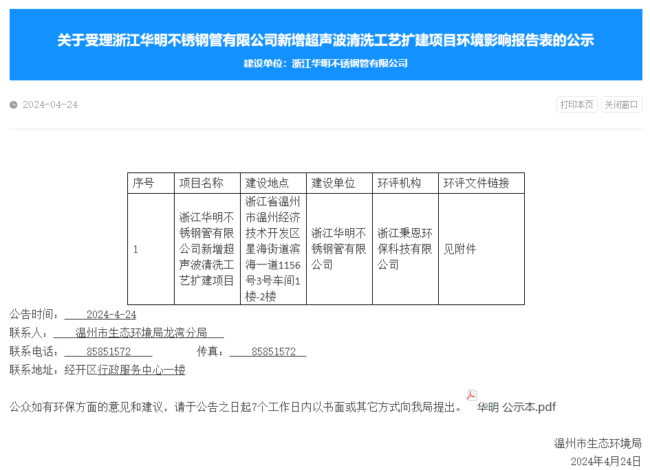 4月24日,溫州市生態(tài)環(huán)境局受理浙江華明不銹鋼管有限公司新增超聲波清洗工藝擴建項目環(huán)境影響報告表并對外進(jìn)行公示,公示期:7個工作日。