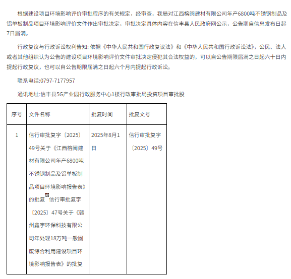 8月6日,江西信豐縣縣政府綜合部門發(fā)布了《關(guān)于江西榕閩建材有限公司年產(chǎn)6800噸不銹鋼制品及鋁單板制品項目環(huán)境影響評價文件審批決定》。