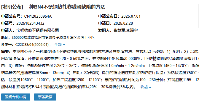 2025年7月1日,寶鋼德盛不銹鋼有限公司成功申請(qǐng)一項(xiàng)名為“一種BN4不銹鋼熱軋卷線鱗缺陷的方法”專利,申請(qǐng)公布號(hào)為CN120230954A,申請(qǐng)日期為2025年2月28日。