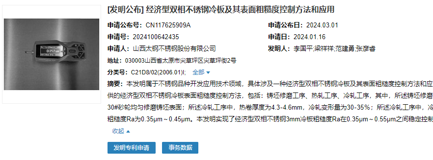 2024年3月1日,山西太鋼不銹鋼股份有限公司成功申請(qǐng)一項(xiàng)名為“一種用于超低碳不銹鋼管的防止熱處理增碳的方法”專(zhuān)利,申請(qǐng)公布號(hào)CN117625909A,申請(qǐng)日期為2024年1月16日。