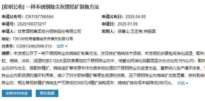 2025年4月8日,甘肅酒鋼集團宏興鋼鐵股份有限公司成功申請一項名為“一種不銹鋼除塵灰燒結(jié)礦制備方法”專利,申請公布號為CN119776655A,申請日期為2025年1月9日。