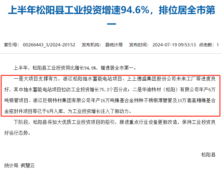 7月19日,據(jù)松陽縣統(tǒng)計局發(fā)文稱,“上半年,松陽縣工業(yè)投資同比增長94.6%,增速居全市第一。”