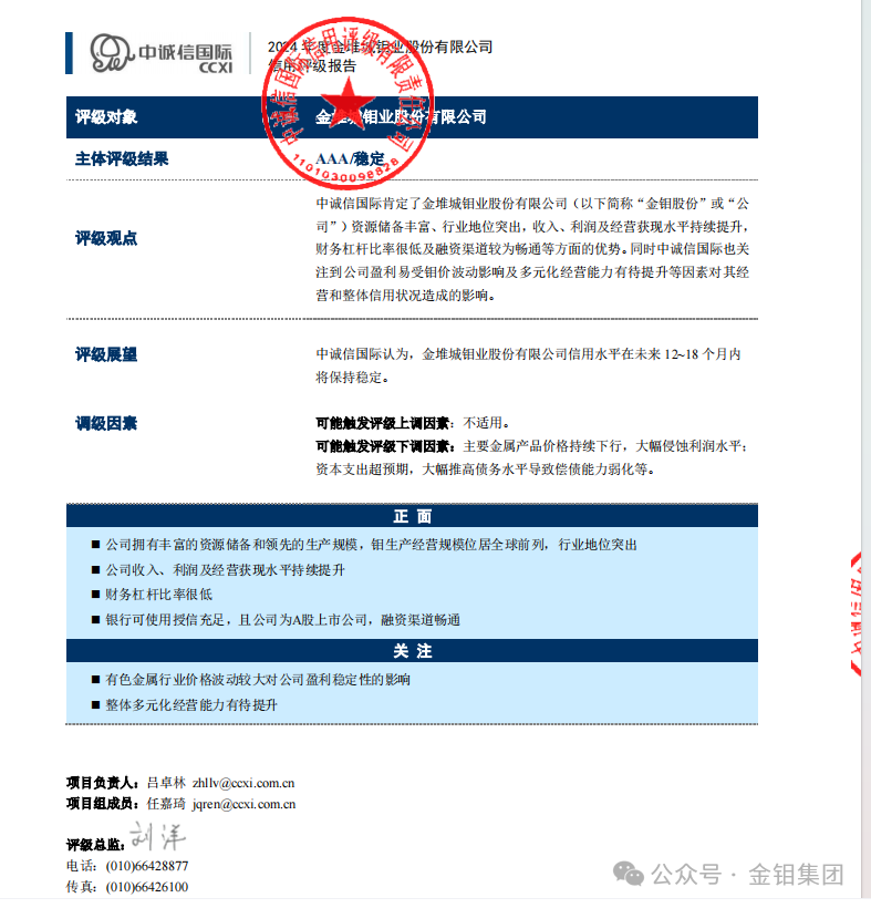 近日,金堆城鉬業(yè)股份有限公司榮獲國內(nèi)權(quán)威信用評級機(jī)構(gòu)中誠信國際信用評級有限責(zé)任公司AAA主體信用評級。這是金鉬股份首次參與外部評級,并獲得主體信用評級AAA的最高等級。